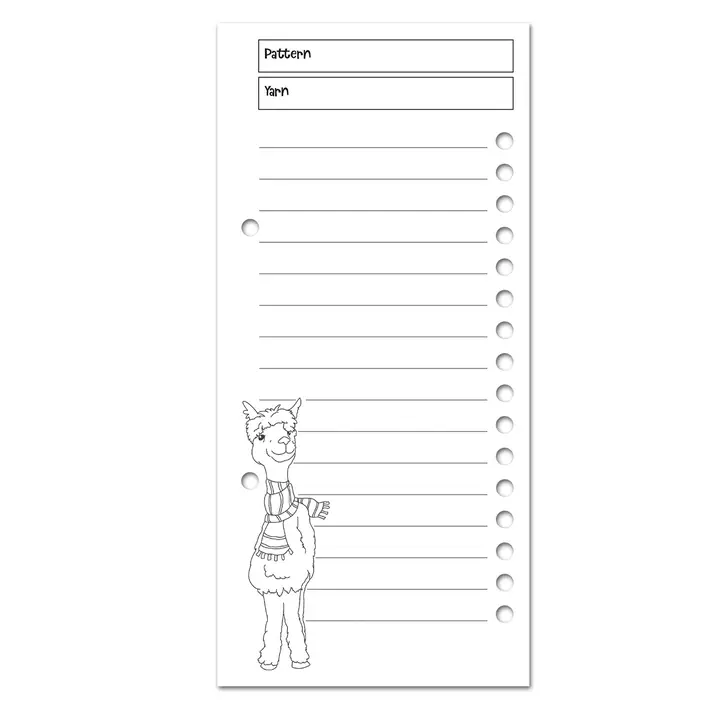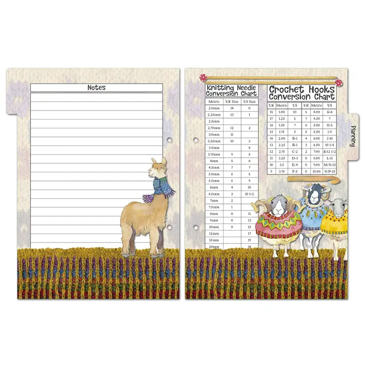 Una carpeta que contiene todo lo que necesitas para organizar tu vida lanuda. 18 x 22 x 3 cm de tamaño, contiene hojas A5 en su interior, práctico cuadrilátero calibre y reglas impresas en el interior de la carpeta en centímetros y pulgadas. Cinco prácticas pestañas con información y espacio para notas en cada una de ellas (tamaños de aguja, abreviaturas y grosores del hilo) Páginas para las notas del patrón para que puedas volver a un proyecto sabiendo dónde lo dejaste, etc. Papel cuadriculado para diseñar tus propios patrones o tomar notas. Planificador de proyectos y lista de deseos, páginas para enumerar tu colección, diez prácticas tarjetas para atar hilos para tus proyectos de color, etc.