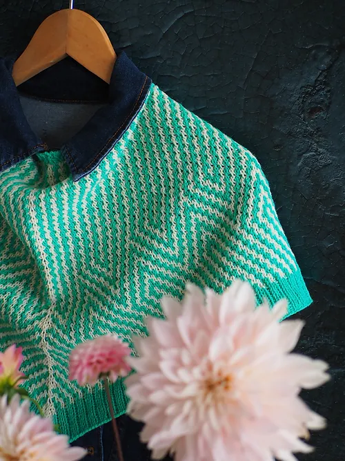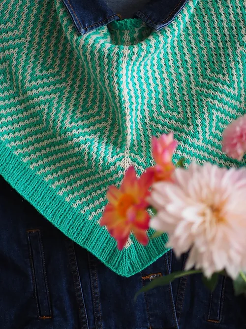 Este chal se teje de arriba hacia abajo (top down) empezando por el borde superior, en el centro, con el montaje “garter tab” o montaje de borde en punto del derecho, y creciendo hacia los laterales y hacia abajo, su forma final es triangular.